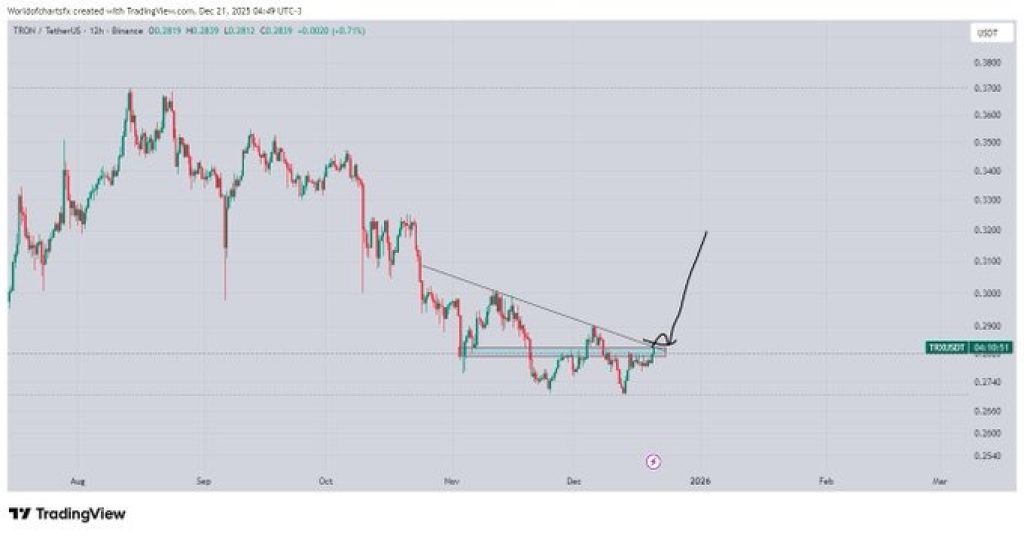 سعر TRON (TRX) قد وصل إلى منطقة سعرية أوقفت كل ارتفاعات الأسعار لعدة أشهر. بعد فترة طويلة من القمم المنخفضة، تختبر TRX مرة أخرى خط اتجاه هابط قد دافع عنه البائعون مرارًا وتكرارًا. يأتي هذا الاختبار بعد ارتفاع تدريجي من المستويات المنخفضة الأخيرة، مما يجعل السوق في نقطة يصعب تجنب اتخاذ قرار. لم يعد السعر ينزلق للأسفل. إنه يتماسك تحت مستوى المقاومة ويتحرك بشكل جانبي مع تقلبات أكثر ضيقًا. هذا النوع من السلوك غالبًا ما يظهر قبل حركة واضحة. ما يهم الآن هو ما إذا كان المشترون يمكنهم تجاوز هذا المستوى، أو إذا تدخل البائعون وأجبروا على رفض آخر.