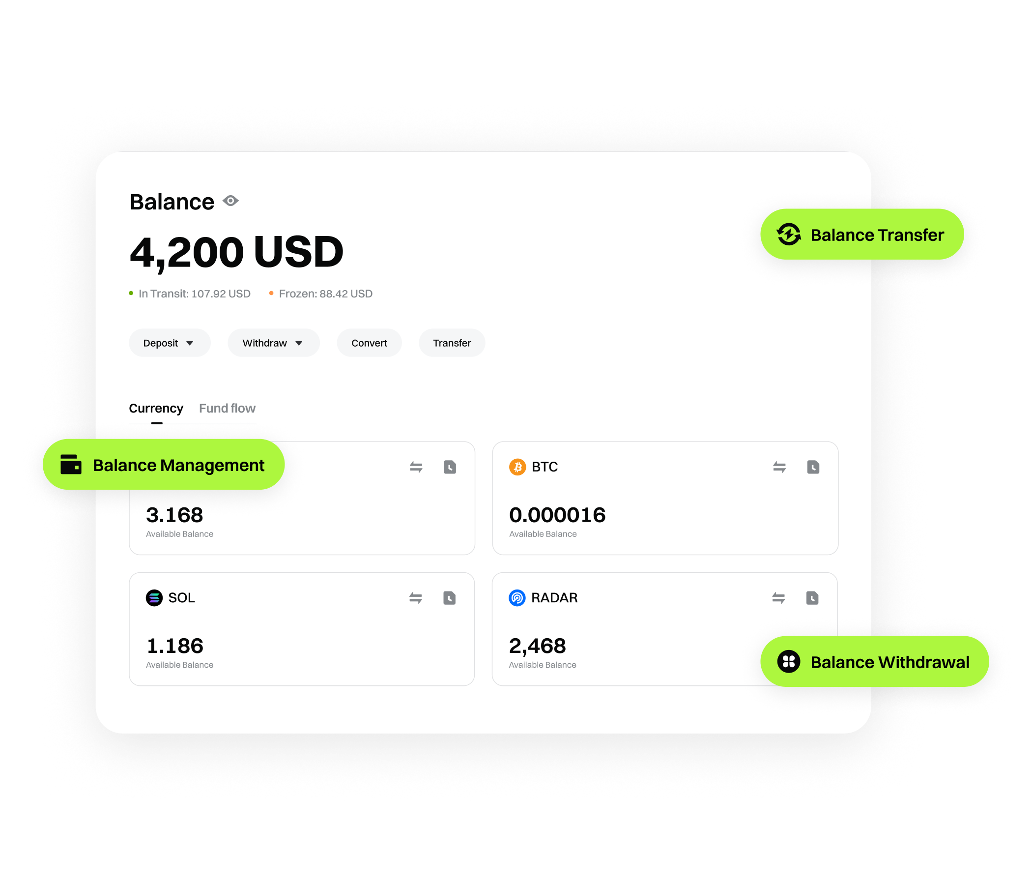 Manage multi-currency balances, transfer funds between accounts, and withdraw assets with ease.
