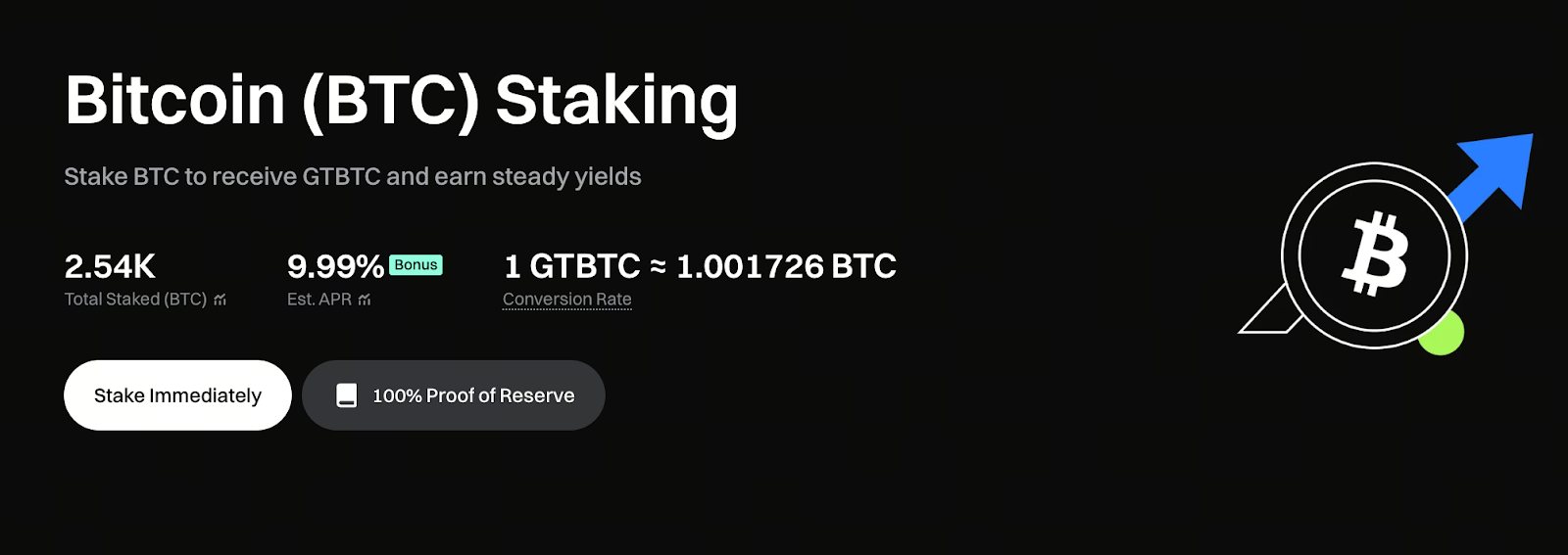 - Staking flexible : GTBTC vous permet de générer des rendements élevés tout en conservant une option de retrait flexible. Contrairement à de nombreux produits de staking, GTBTC autorise le retrait à tout moment. Les demandes sont généralement traitées sous trois jours, maintenant la liquidité de votre Bitcoin.