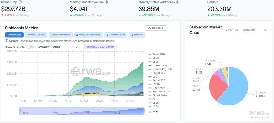 稳定币总市值达2,977.20亿美元,环比上月同期微降0.47%;月度转账量维持4.94万亿美元高位,环比上月同期大涨18.44%;月活地址总数进一步增至3,985.00万,环比上月同期大涨32.56%;持有者总数稳步增长至2.03亿,环比上月同期微增3.03%,两者共同验证市场运行效率持续优化——在规模小幅收缩背景下,资金周转效率与用户活跃度依然强劲,凸显链上支付结算需求的刚性。数据表明,市场已进入存量优化阶段,转账量稳健增长与活跃地址提升显示生态韧性,但市值连续收缩或反映机构配置性资金暂未入场。头部稳定币为USDT、USDC及USDS,其中USDT市值环比上月同期微涨0.22%;USDC市值环比上月同期微降1.92%;USDS市值环比上月同期上涨2.98%。