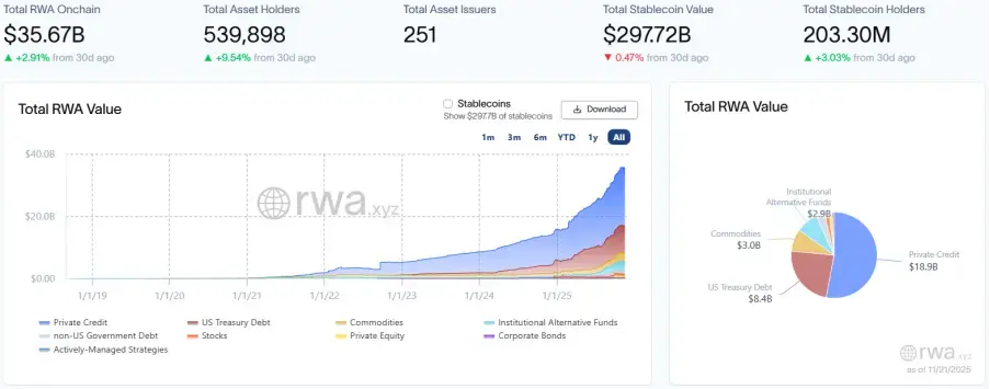 RWA.xyz 最新数据披露,截至2025年11月21日,RWA 链上总市值达356.70亿美元,环比上月同期微增2.91%,增速较前月明显放缓,增长动能减弱;资产持有者总数逆势增至53.99万,环比上月同期上涨9.54%;资产发行方总数为251家,近乎零增长,投资者基数扩大但资产供给停滞。
