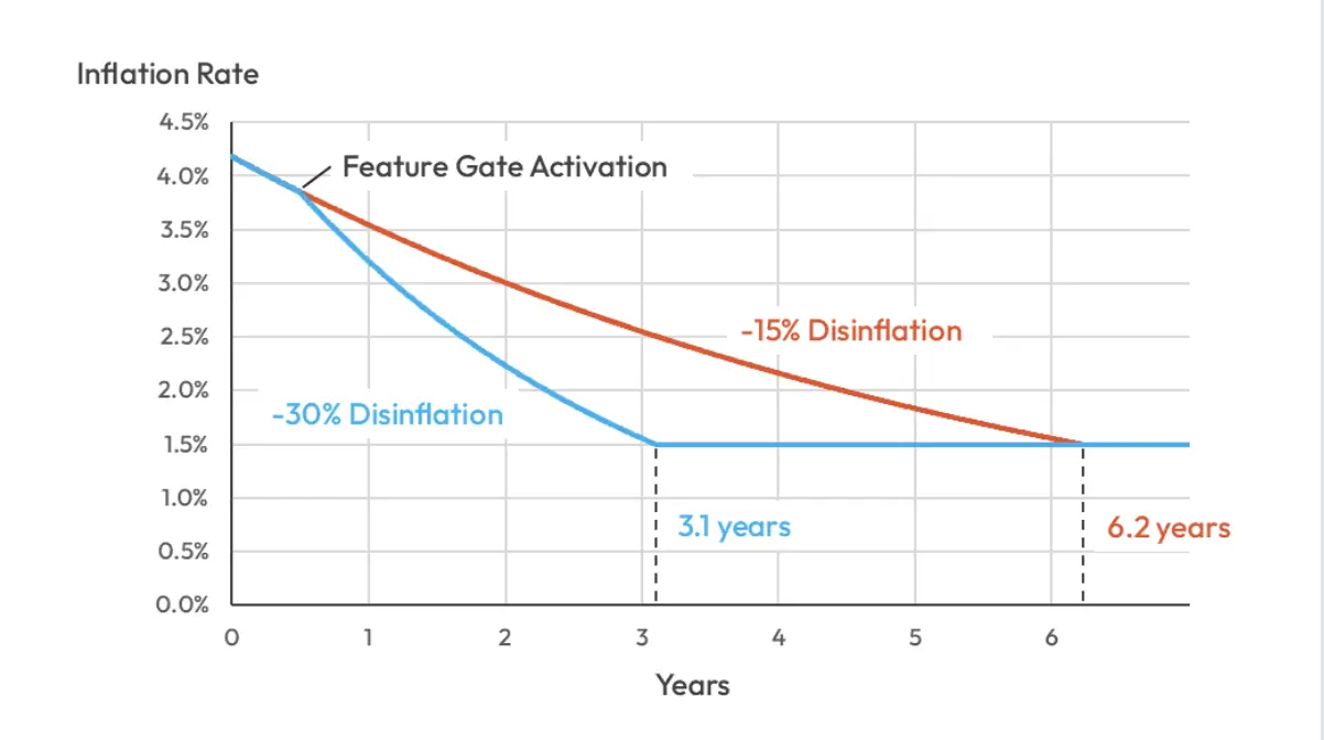 Cette proposition suggère de doubler le taux de décélération de l'inflation de SOL, passant de -15 % à -30 %. Après ajustement des paramètres, cela fera passer le taux d'inflation de SOL de 4,18 % à 1,5 %, le moment où cela sera atteint étant avancé du début de 2032 au début de 2029. Cela signifie que l'objectif d'un taux d'inflation de 1,5 % ne nécessitera que 3,1 ans. Il est prévu qu'avec ces paramètres, la quantité de SOL émise diminuera de 22,3 millions d'unités au cours des 6 prochaines années (selon le mécanisme actuel, la quantité de SOL après 6 ans sera de 721,5 millions d'unités, tandis qu'avec le mécanisme SIMD-0411, elle sera de 699,2 millions d'unités). En prenant en compte le prix de SOL à 140 dollars au moment de la rédaction, cela représente environ 3,12 milliards de dollars.