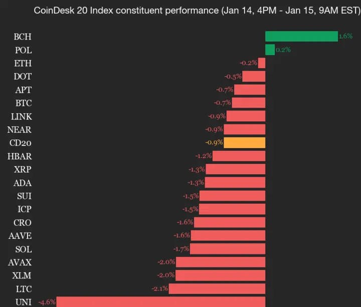 Titre original : CoinDesk 20 Performance Update : Uniswap (UNI) chute de 4,6 %, indice principal en baisse