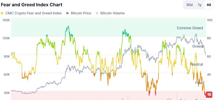 仮想通貨市場は、さらなる投げ売りへの極度な恐怖の中で大きな売りに見舞われました。Fear and Greed Indexによると、仮想通貨トレーダーは3~4月の恐怖と同じ程度の恐怖を示しています。