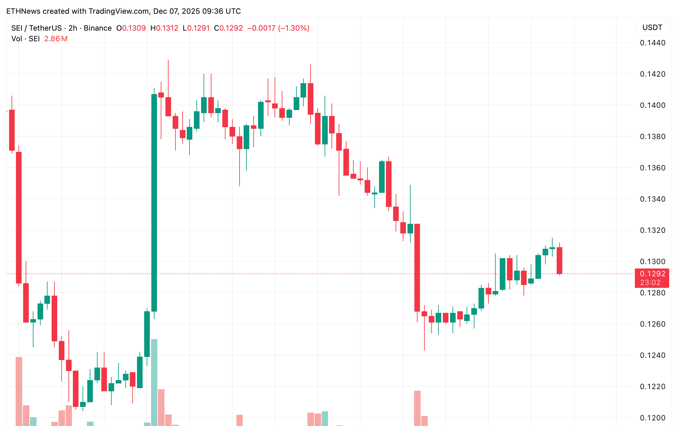 このチャートは、短期的な動きの詳細を示しています。SEIは$0.138~$0.140から$0.125付近まで下落した後、小さな回復構造を形成し始めています。