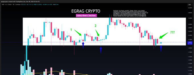 チャートでは、下限付近で同様の反応が繰り返し発生しているのが分かります。価格が下落し、出来高が減少、買い手が吸収し、XRPが中間レンジへ戻る。このリズムが何度も形成されており、分配ではなく蓄積の一貫したパターンが構築されています。