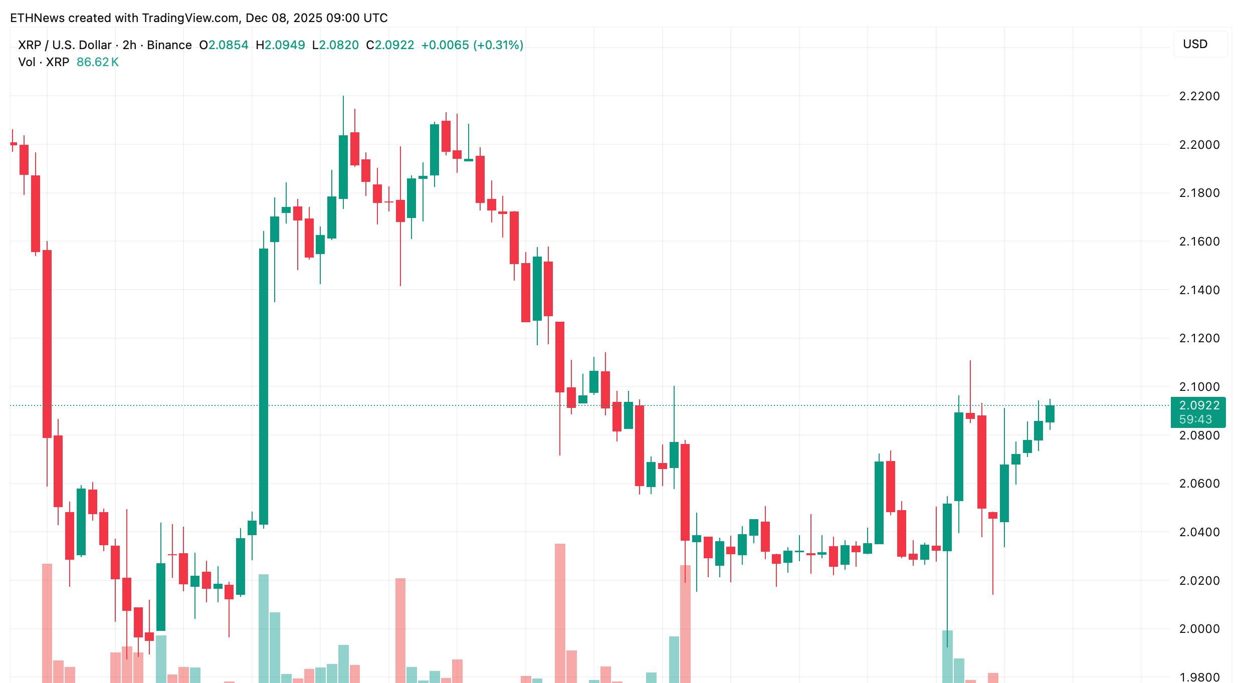 ブレイクアウトが発生するまでは、XRPは狭い範囲で変動し続けており、TradingViewのチャートでは週初の反落後に$2.09へと徐々に回復している様子が示されています。この狭い値動きはトライアングル圧縮の最終段階に典型的であり、ボラティリティが縮小することで、再び勢いが戻る前兆といえます。