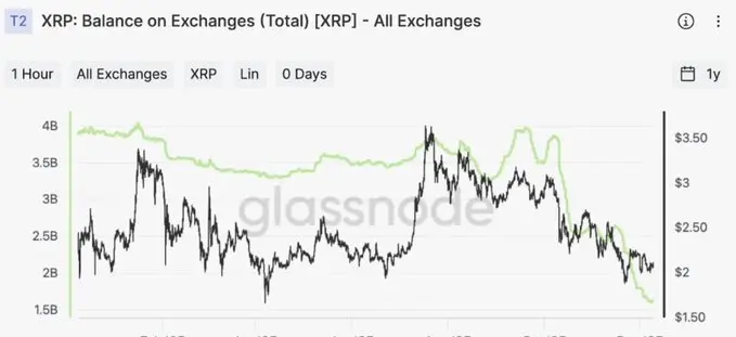 • XRPの取引所残高は2025年に40億超から約16億~17億に減少し、大幅な供給削減を示した。