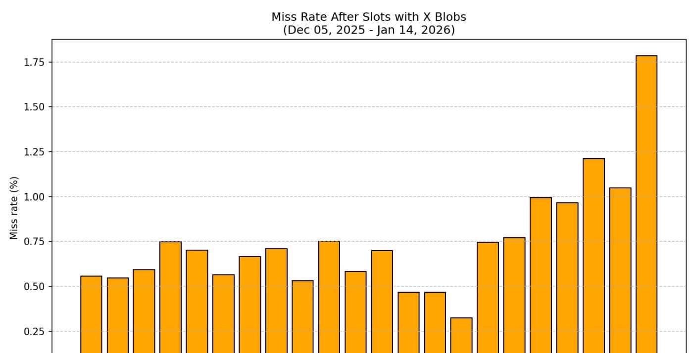 低いblob数では、基準のミス率は約0.5%です。16以上のblobに達すると、ミス率は0.77%から1.79%に上昇します。2回目のオーバーライドで導入された最大容量の21 blobでは、ミス率は1.79%に達し、基準の3倍以上です。
