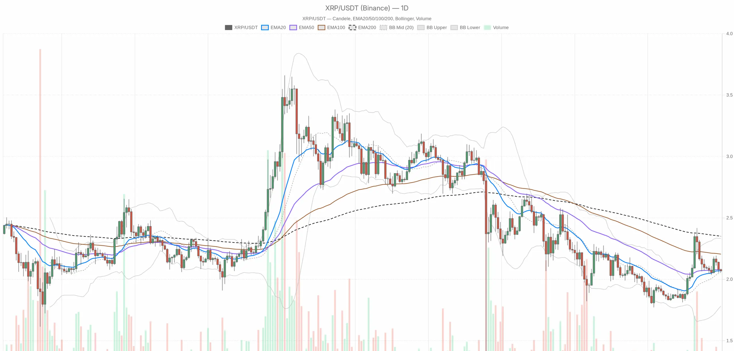 XRP/USDT — 日足チャート(ローソク足、EMA20/EMA50、出来高)