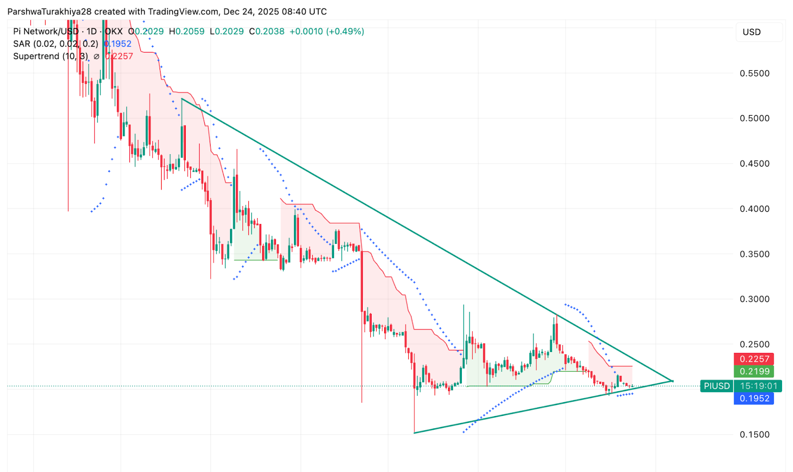 今日のPi価格は$0.204付近で取引されており、短期の重要なサポートゾーンのすぐ上に位置しながら、下降ウェッジの頂点に向かって圧縮されている。構造は市場が決定点にあることを反映している。売り手は引き続き全体のトレンドを支配しているが、買い手が$0.195から$0.200のエリアを繰り返し防衛しているため、下落の勢いは鈍化している。