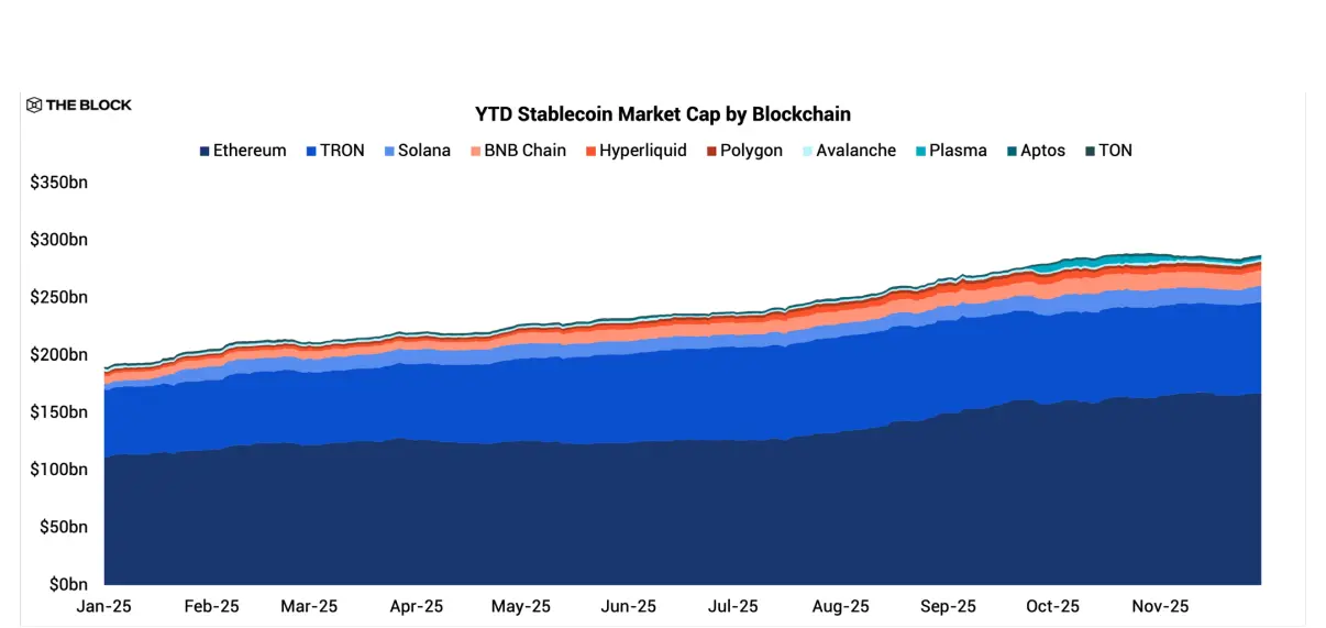 Stablecoin circulating supply reached approximately $300 billion as these assets achieved clear product-market fit. Major payment networks have integrated stablecoins into their infrastructure, with new blockchain networks being developed specifically for stablecoin transactions.
