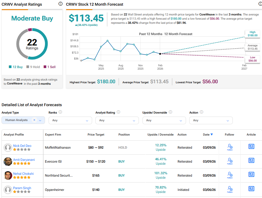 Overall, Wall Street has a Moderate Buy consensus rating on CoreWeave stock based on 12 Buys, nine Holds, and one Sell recommendation. The average CRWV stock price target of $113.45 indicates 38.42% upside potential.