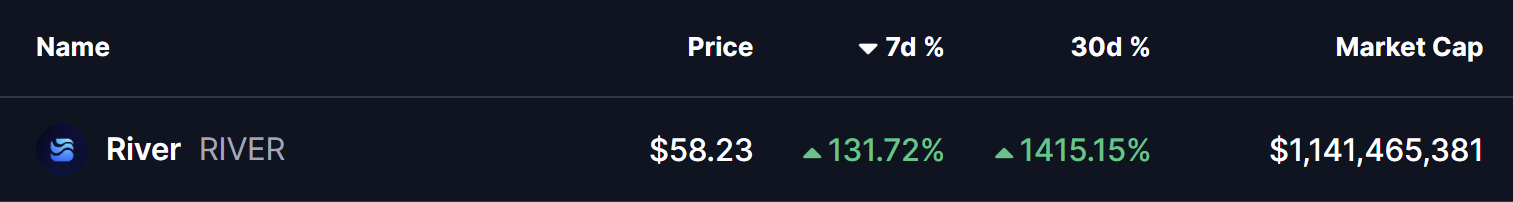O River (RIVER) tem sido um dos destaques no mercado de criptomoedas recentemente. Segundo dados do CoinMarketCap, o RIVER está atualmente negociado perto de $58,79, registrando um ganho impressionante de 131% nos últimos 7 dias e um aumento ainda mais surpreendente de +1.415% nos últimos 30 dias.