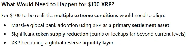 Em vez disso, várias condições principais precisariam estar alinhadas antes que o XRP pudesse alcançar uma valorização significativa, quanto mais atingir os $100: