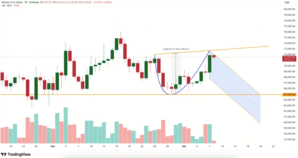 Até 8 de abril de 2026, os dados de mercado da Gate mostram que a cotação do Bitcoin é de 71.675,1 dólares, com um volume de transações de 1,17 mil milhões de dólares nas últimas 24 horas, uma capitalização de mercado de cerca de 1,33 biliões de dólares e uma quota de mercado de 55,27%. Desde o recuo faseado em finais de março, o gráfico diário do Bitcoin tem vindo a construir gradualmente uma forma de continuação de alta — uma estrutura de “copo e bandeira”. O objetivo de medição técnico desta estrutura aponta para cerca de 78.000 dólares; em paralelo, verificou-se uma aceleração significativa tanto nos fluxos de capital institucional para o mercado como no comportamento de retirada de moedas on-chain. A sobreposição dos sinais técnicos e dos sinais de fluxo de fundos faz com que o intervalo de preços atual seja uma janela importante para observar a escolha da direção subsequente. Este artigo irá analisar, em cinco dimensões — contexto do evento, decomposição da estrutura, validação pelos fundos, divergências na opinião pública e caminho de evolução — distinguindo rigorosamente factos, opiniões e especulações, para oferecer aos leitores um quadro lógico verificável.