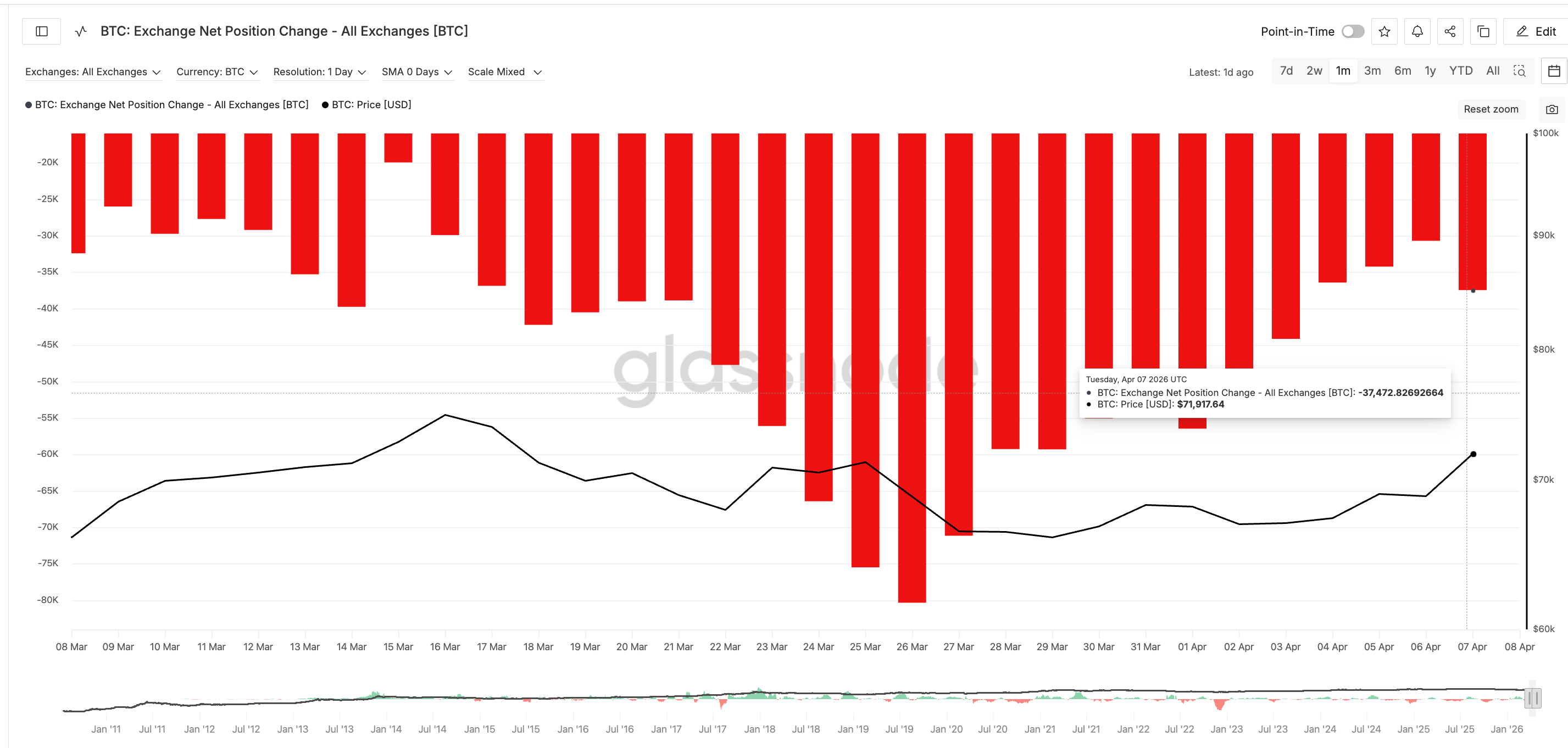 Em segundo lugar, o comportamento de retirada de moedas on-chain intensificou-se. Com base nas alterações das posições líquidas das bolsas, a quantidade de Bitcoin que saiu das exchanges em 6 de abril foi de 30.727 unidades; em 7 de abril, esse valor aprofundou-se para 37.472 unidades, com um aumento diário de cerca de 22%. Um valor de posição líquida negativo significa que a quantidade de Bitcoin retirada das exchanges para carteiras privadas é superior à quantidade depositada, e que a intensidade da saída está a apresentar uma tendência de aceleração no curto prazo.