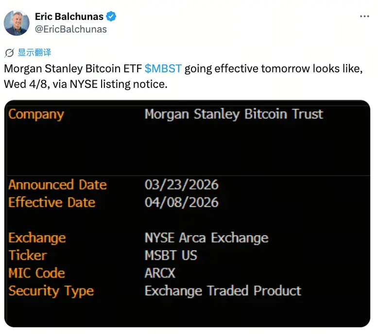 Em 8 de abril de 2026 (quarta-feira), o trust de bitcoin da Morgan Stanley (Morgan Stanley Bitcoin Trust) entrou oficialmente em negociação no mercado NYSE Arca. O código de negociação é MSBT. A NYSE emitiu, em 7 de abril (terça-feira), uma notificação de listagem confirmando que o produto foi aprovado para ser colocado em negociação. Este é o primeiro ETF de bitcoin spot nos EUA emitido diretamente por um grande banco comercial e, igualmente, o primeiro novo ETF de bitcoin spot desde julho de 2024.