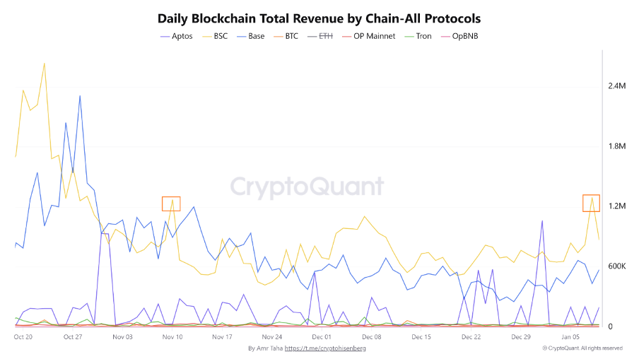 Conforme observado pelo analista CryptoQuant Amr Taha, a receita da blockchain da BSC atingiu o seu pico de vários meses a 8 de janeiro. Nesse dia, a rede gerou aproximadamente $1,3 milhões em taxas diárias. E, com isso, a rede efetivamente superou o seu recorde anterior de cerca de $1,27 milhões, estabelecido a 30 de novembro.