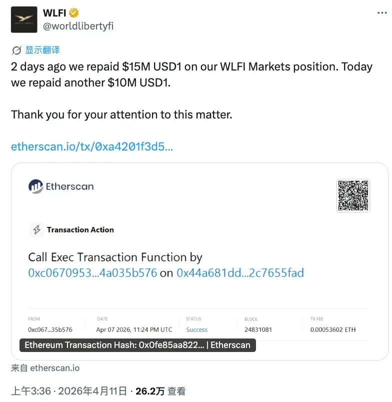 O evento de empréstimo foi inicialmente reportado a 9 de abril, e no dia seguinte o preço do WLFI caiu quase 15%. Após forte reação da comunidade, a World Liberty Financial reembolsou 15 milhões de dólares a 7 de abril e, a 10 de abril, acrescentou mais 10 milhões de dólares, totalizando 25 milhões de dólares.