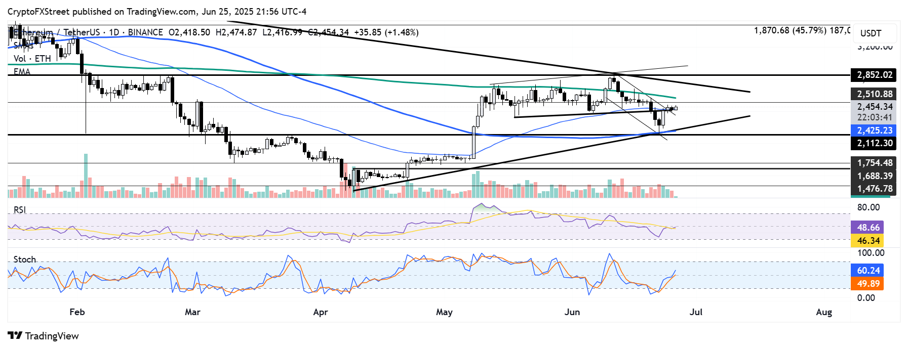 С положительной стороны, ETH должен突破 уровень сопротивления в 2500 долларов и 200-дневную простую скользящую среднюю (SMA), чтобы протестировать верхнюю границу симметричного треугольника и возможный ключевой уровень в 2850 долларов.
