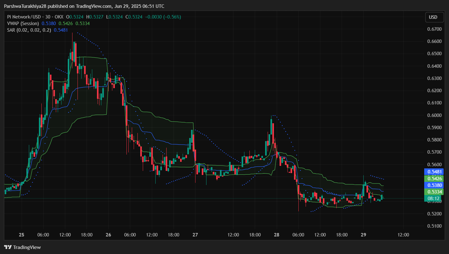 В то же время движение цены токена PI находится между объемно-взвешенной средней ценой (VWAP) (0,538 долларов) и линией поддержки (0,527 долларов), образуя сужающуюся клиновидную структуру. Сужение полосы Боллинджера также поддерживает этот тренд, предвещая предстоящую волатильность.