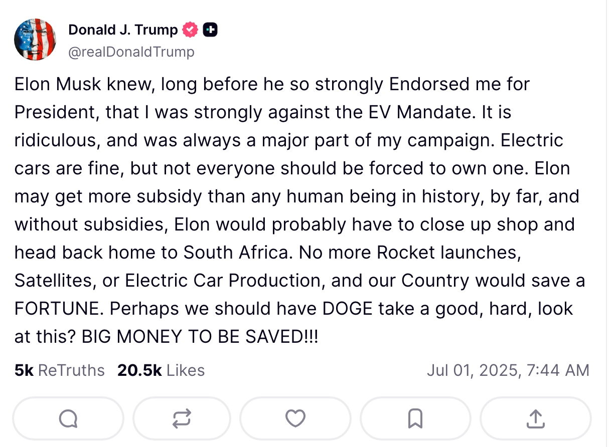 Дональд Трамп раскритиковал Маска, заявив, что он осознал его недовольство субсидиями на электромобили, когда поддерживал Маска. Он также угрожал сократить финансирование другой компании Маска SpaceX, которая подписала контракты на миллиарды долларов с правительством.