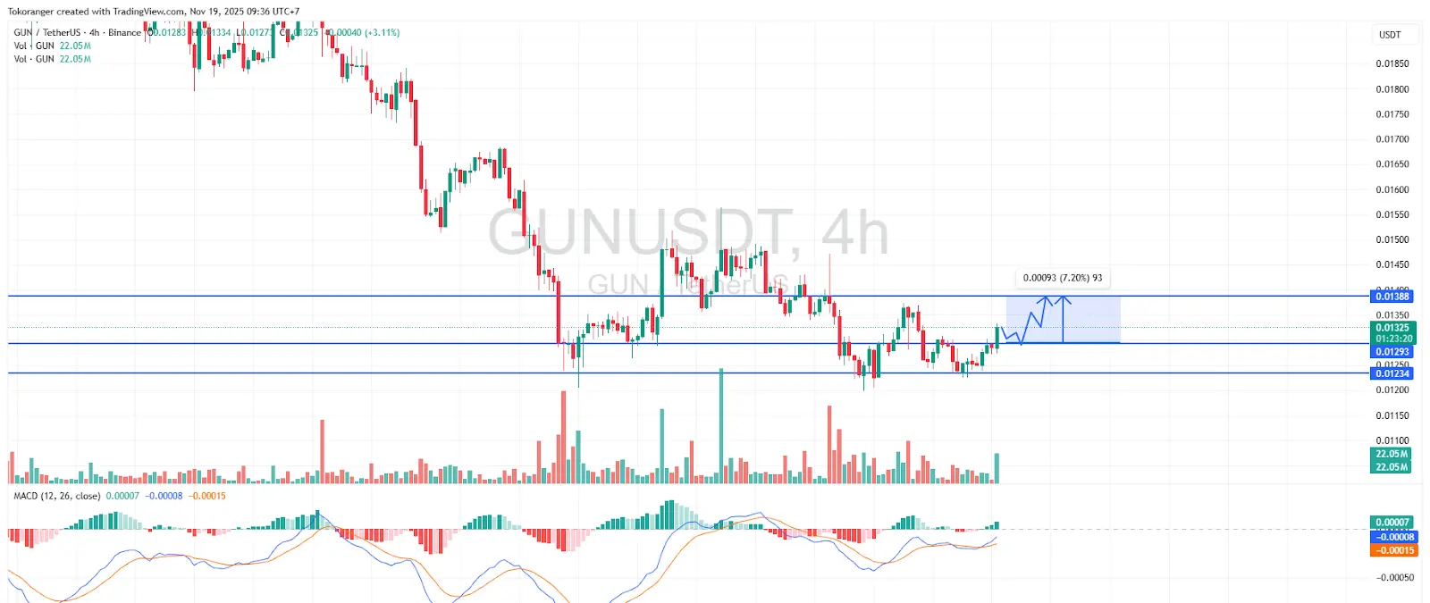 Движение GUN начинает демонстрировать четкий отскок от зоны поддержки 0.01234-0.01293, что говорит о постепенном возвращении покупателей после продолжительной коррекции. Пока цена удерживается выше этой зоны, есть шанс на рост к ближайшему сопротивлению 0.01388, при этом MACD начинает формировать слабый бычий импульс на дне.