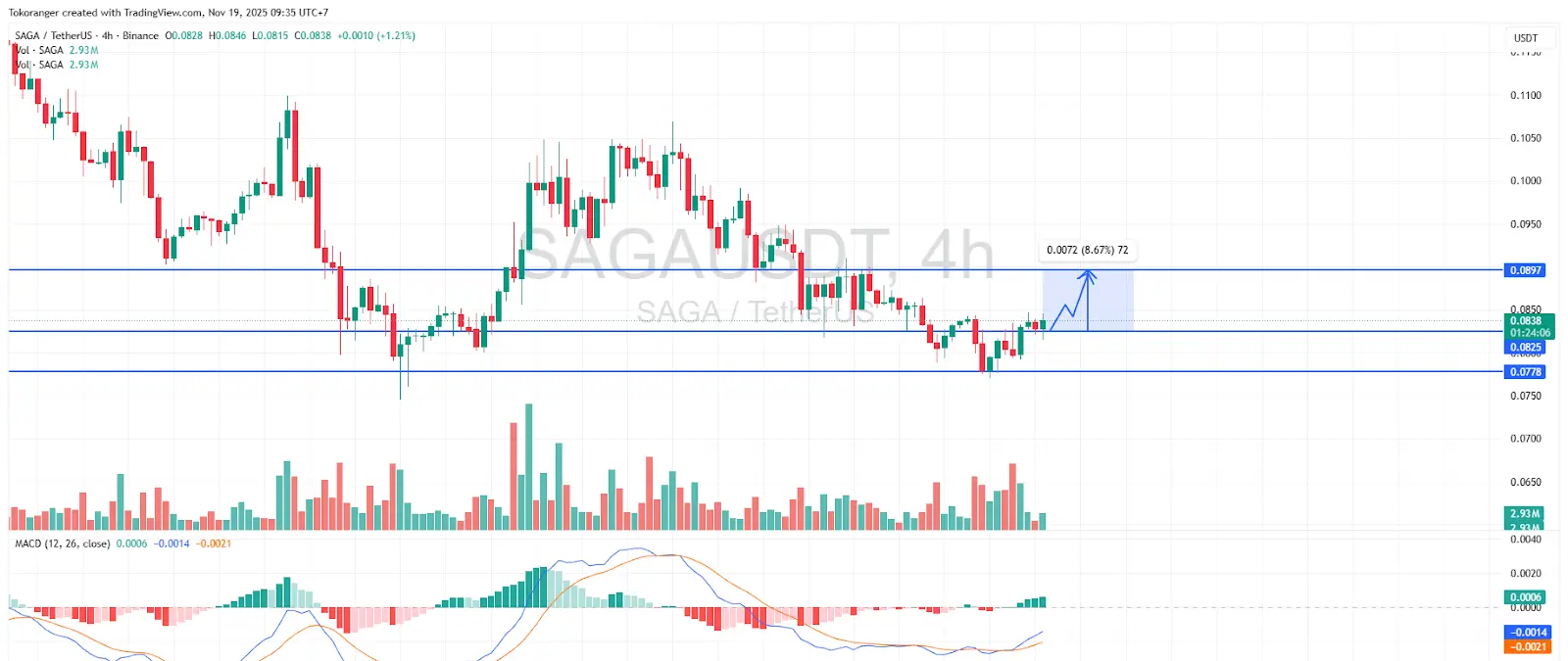 SAGA сейчас пытается восстановиться из зоны поддержки 0.0778-0.0825, и последняя бычья свеча указывает на то, что покупатели начинают перехватывать инициативу. Пока цена удерживается выше уровня входа 0.0825, есть потенциал роста к сопротивлению 0.0897, особенно учитывая, что MACD начинает формировать положительный импульс, указывая на смену тренда с нисходящего на восходящий.