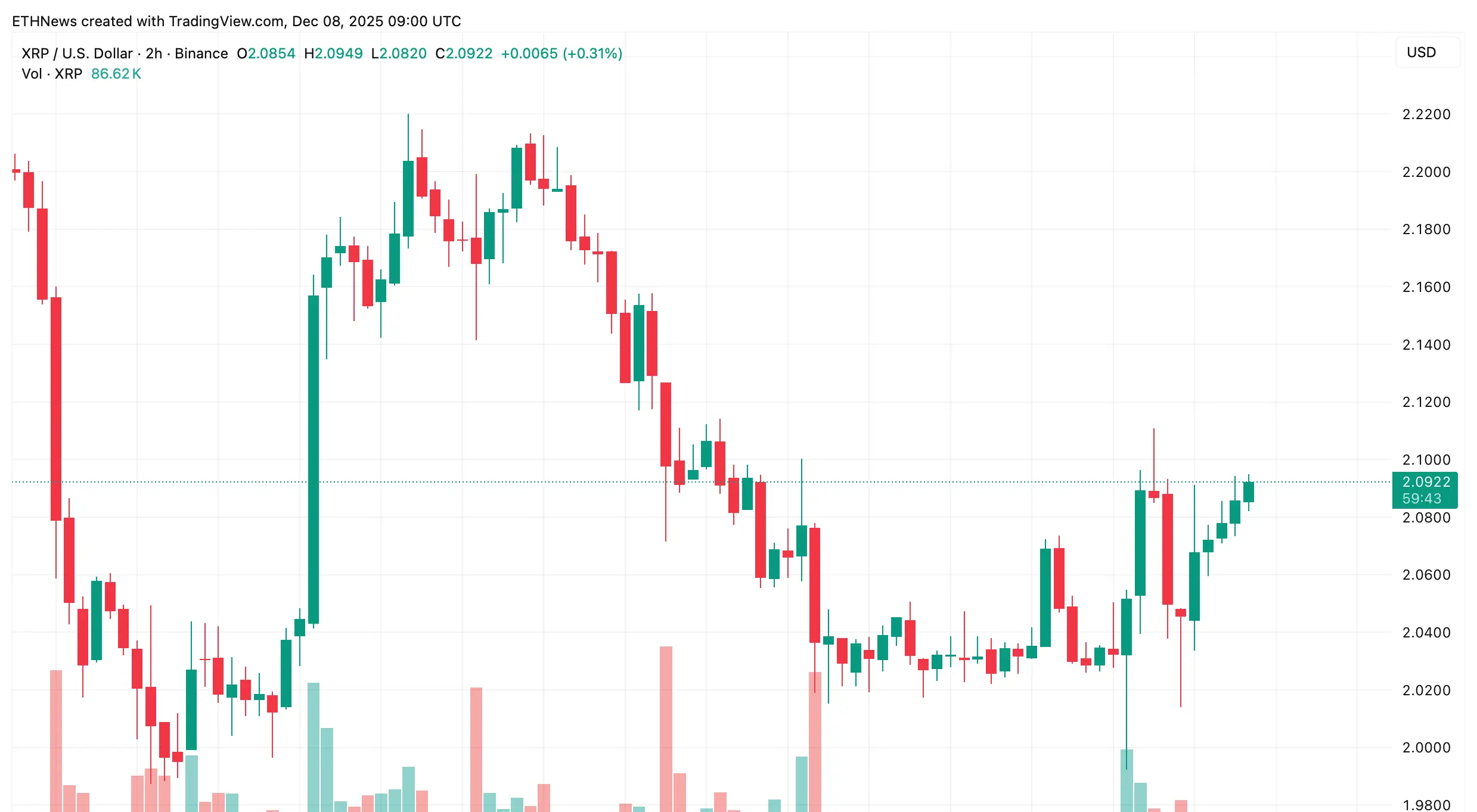 До появления прорыва XRP продолжает двигаться в узком диапазоне, а на графике TradingView видна постепенная коррекция к $2,09 после отката в начале недели. Такой сужающийся диапазон типичен для финальной фазы сжатия треугольника, когда волатильность сокращается перед возвращением импульса.