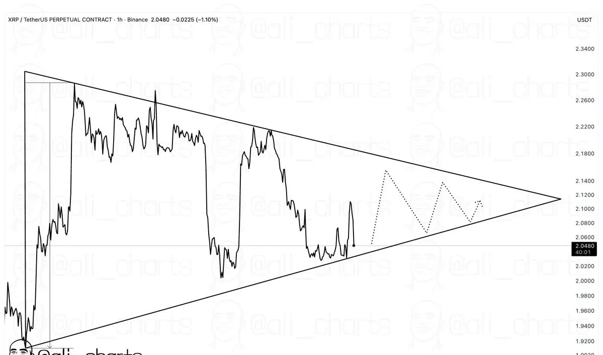 Краткосрочный график показывает, что XRP скручивается внутри большого симметричного треугольника, на который ранее указывал аналитик Али Мартинес. Каждый новый минимум выше предыдущего и максимум ниже предыдущего подтягивает цену ближе к вершине, и сейчас паттерн подходит к стадии, когда обычно происходят прорывы.