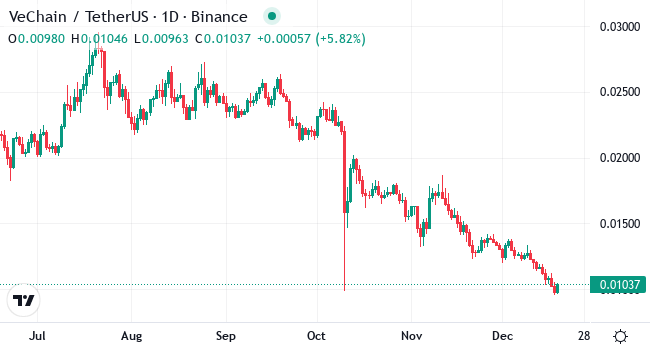VeChain (VET) เป็นสกุลเงินดิจิทัลที่ออกแบบมาเพื่อปรับปรุงการจัดการห่วงโซ่อุปทาน สร้างขึ้นบนเทคโนโลยีบล็อกเชน ช่วยให้สามารถติดตามผลิตภัณฑ์ได้อย่างปลอดภัยและโปร่งใสตั้งแต่การสร้างจนถึงการส่งมอบ ซึ่งรับประกันความถูกต้องและลดการฉ้อโกง แม้ว่าตลาดจะมีการลดลงเมื่อเร็ว ๆ นี้ VET ก็แสดงให้เห็นถึงศักยภาพที่แข็งแกร่งในการเติบโต เหรียญนี้ได้สร้างรากฐานที่มั่นคง โดยได้รับความร่วมมือจากบริษัทใหญ่ ๆ ในหลายอุตสาหกรรม ความร่วมมือเหล่านี้แสดงให้เห็นถึงความไว้วางใจในเทคโนโลยีของ VeChain ขณะที่ตลาดเตรียมพร้อมสำหรับฤดูกาล Altcoin ที่มีศักยภาพอีกครั้ง VET ยังคงโดดเด่นเป็นตัวเลือกที่น่าสนใจ การใช้งานในโลกจริงและการนำไปใช้ที่เพิ่มขึ้นทำให้มันเป็นผู้แข่งขันที่แข็งแกร่งในรอบตลาดปัจจุบัน