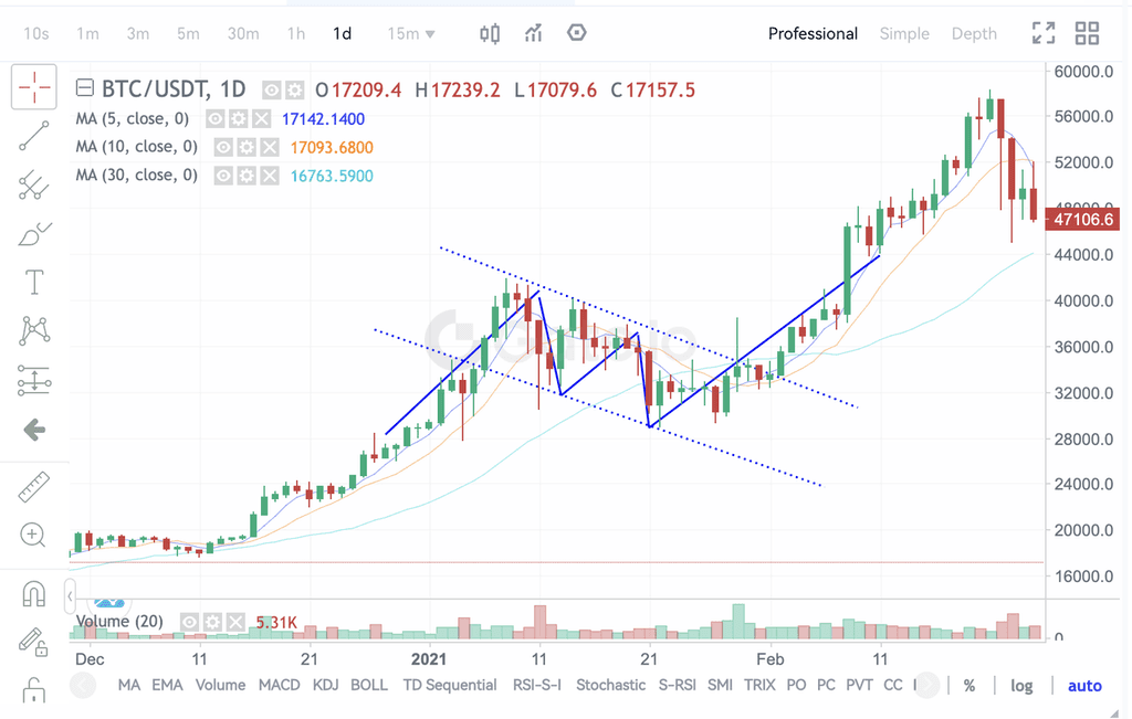 Yukarıdaki grafik, 28 Aralık 2020 ile 13 Mayıs 2021 arasındaki dönemi kapsayan Gate BTC/USDT günlük grafiğini göstermektedir. BTC, 69.000 dolardan 33.000 dolara düşerek dramatik bir düşüş yaşadı. Daha sonra fiyat 33.000 ila 45.000 dolar arasında salınmaya başladı ve yavaş yavaş düşüş bayrağı deseni oluşturdu. Coin fiyatı bayrağın alt kenarı olan 40.000 doların altına düştüğünde güçlü bir düşüş eğilimi başlattı ve sonunda 17.000 dolara kadar düştü.
