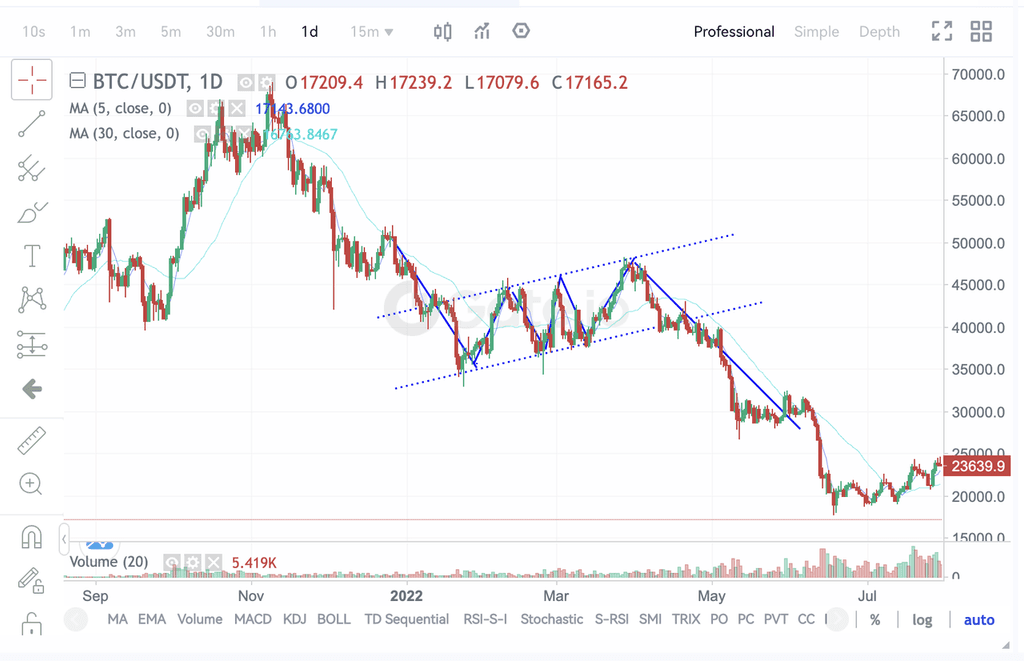 ②. Coin fiyatı ilk önce neredeyse dikey açılı bir eğim boyunca keskin bir şekilde düşerek bir bayrak direği oluşturur. Ardından, hafifçe yukarı doğru eğimli bir aralıkta hafifçe konsolidasyon yaparak toparlanmaya başlar. Yüksek noktaları salınım aralığının yüksek noktalarına bağlayarak bayrak deseninin gövdesini oluşturan iki paralel çizgi çizilebilir;