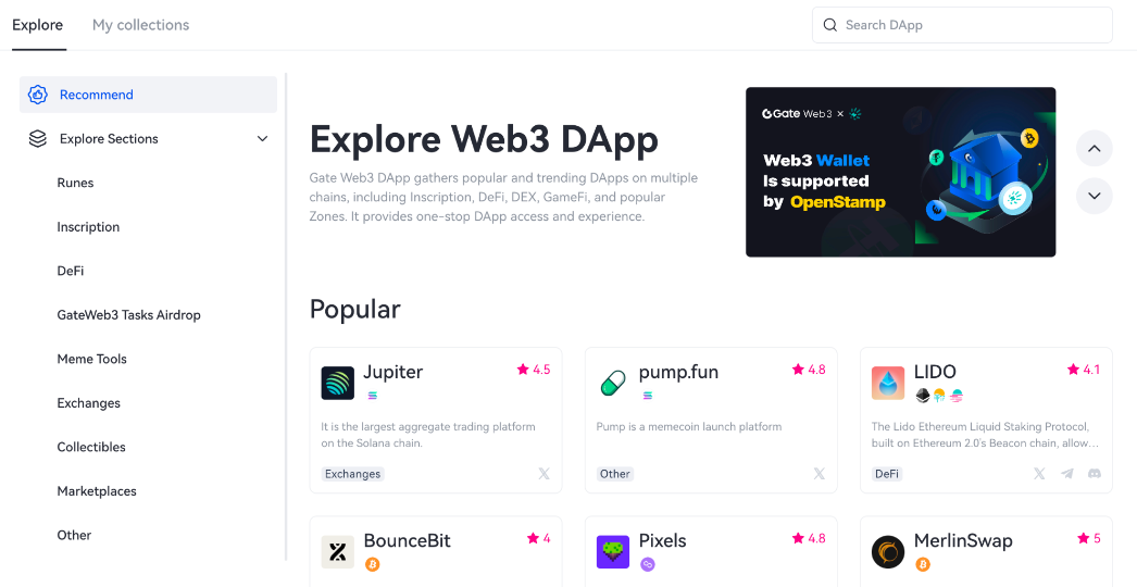 Gate Web3 sayfasına gidin ve yukarıdaki menü çubuğunda “DApp”a tıklayarak girin. DApp sayfası.