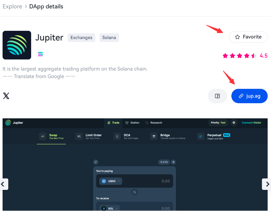 İlgilendiğiniz DApp simgesine tıklayarak DApp detay sayfasına girin. Detay sayfasındaki mavi düğmeye tıklayarak DApp'a doğrudan erişebilir ve kullanabilirsiniz. Bu DApp'ı yer imlerine eklemek için sayfadaki "Favori" düğmesine de tıklayabilirsiniz. Anasayfada, "Favorilerim" bölümünde favori DApp'larınızı görüntüleyebilirsiniz.