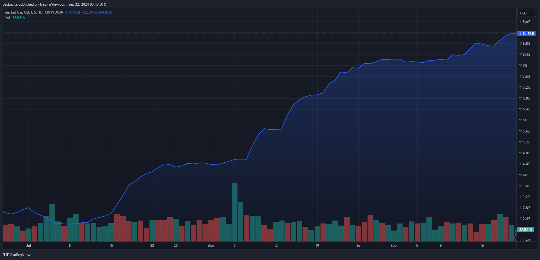 At the helm of the stablecoin market is Tether, which has the largest share of the market cap. As of this writing, Tether’s market cap sits just shy of the $120 billion mark, with a consistent flow of new capital pouring into the stablecoin. Particularly, Tether currently has a market cap of $119 billion, representing a 70.4% stake among all stablecoins. USDC, the second-largest stablecoin, comes in at a current market cap of $35.88 billion.