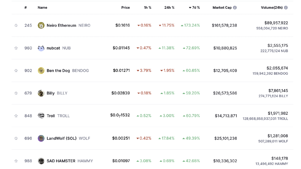 The meme coin sector is surging behind Neiro this week, with a dozen $10 and $20 million market cap token economies flying up the market leaderboards 20%, 50%, and 70% for a week of time in a liquid market parked on the blockchain working as digital capital.