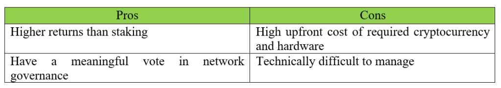 Running a masternode allows users to contribute to the security of specific blockchain networks and get rewards. Master nodes are resource-intensive, with many requiring a high upfront investment in hardware and cryptocurrency. They tend to pay higher rewards as well.