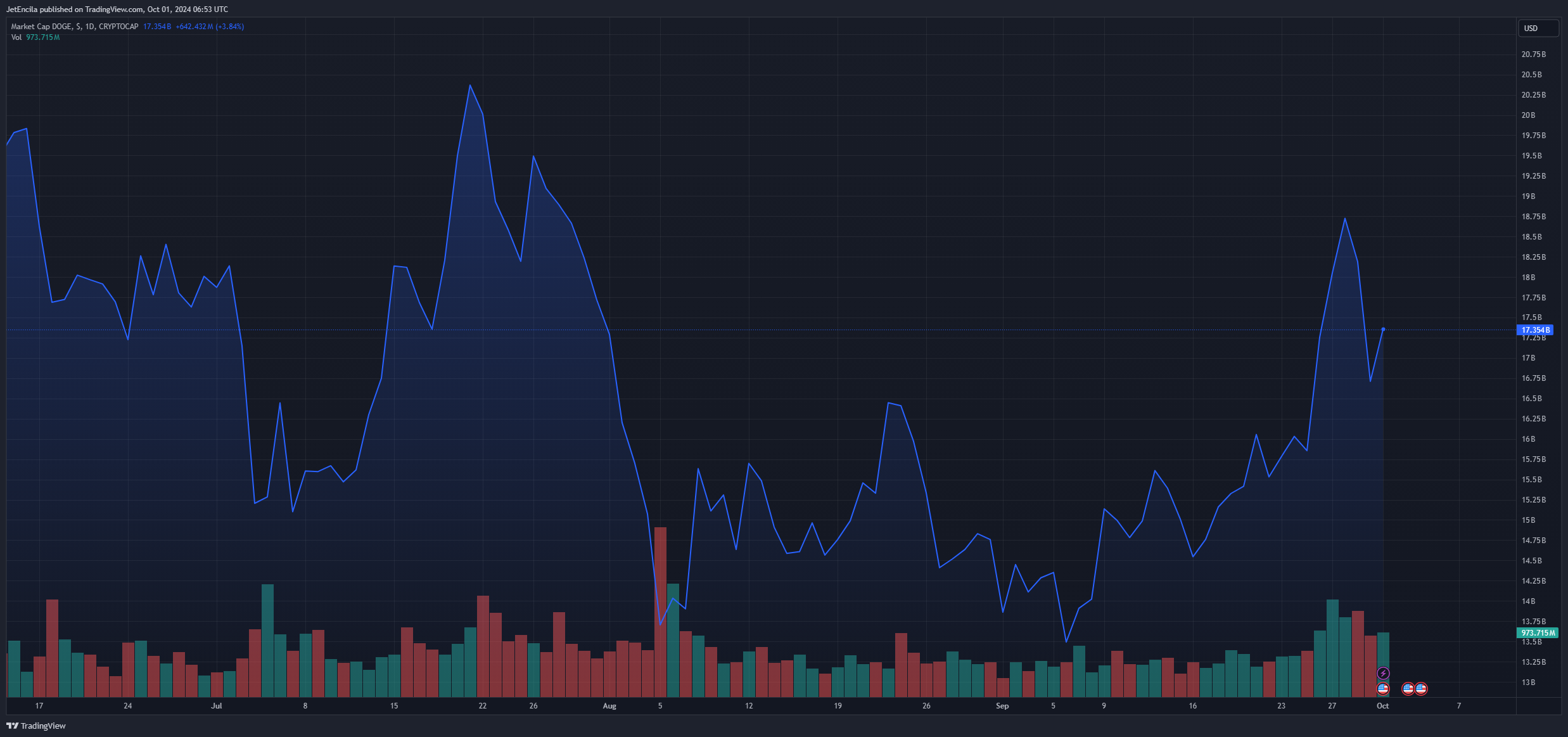 Closely tracking Dogecoin is another analyst – Trader Tardigrade. On the monthly graph of Dogecoin, he noted a technical pattern sometimes referred to as the Falling wedge. This trend sometimes shows positive reversals, implying that the coin might be about to undergo notable price rise. Tardigrade’s observations add still another level of mystery since he calls this era “DOGE season,” stressing the coin’s possible upcoming trajectory for significant gains depending on past trends.
