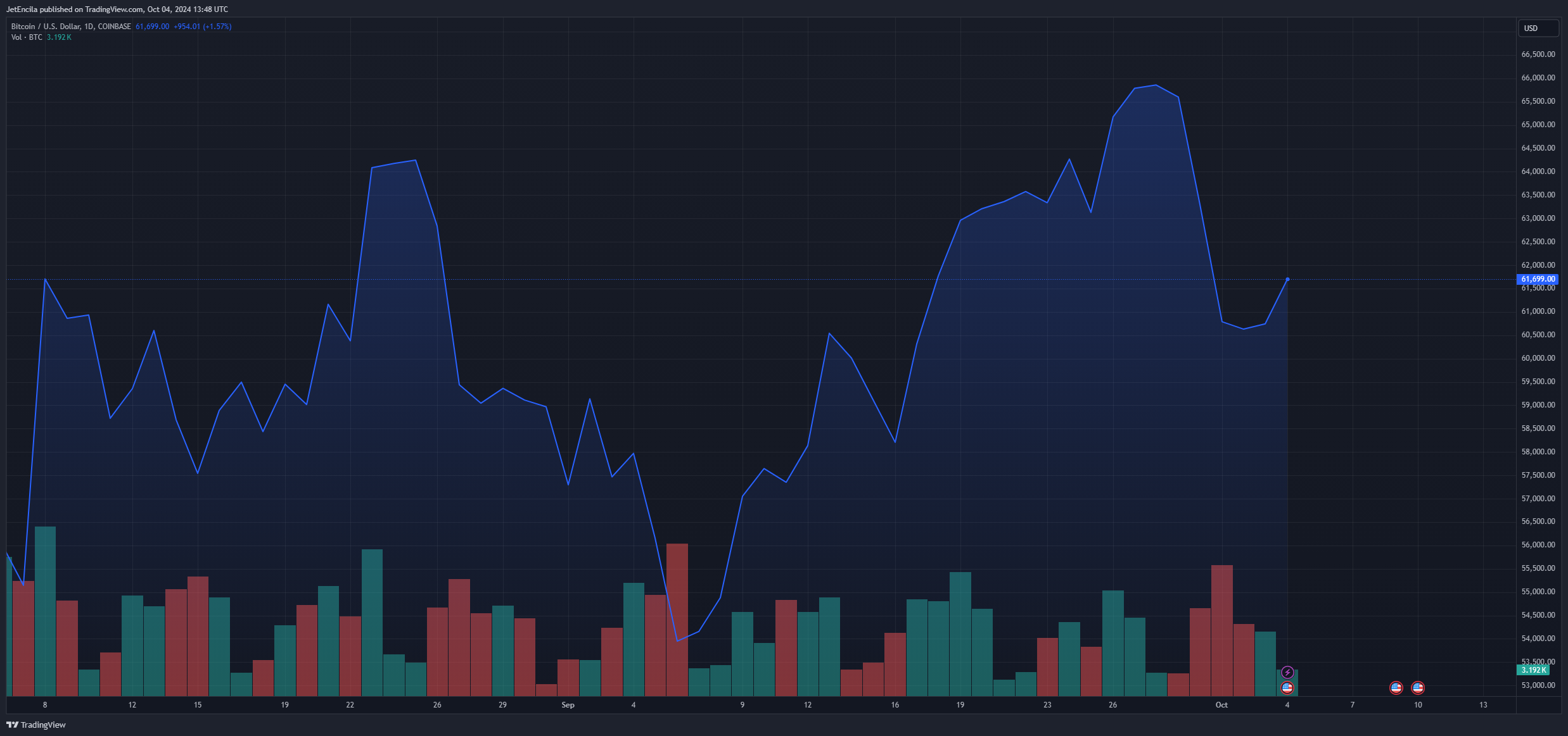 BTCUSD trading at $61,696 on the daily chart: TradingView.com