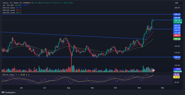 Similar to the XRP price, Solana (SOL) has also faced some profit bookings in the last two sessions. On the weekend, Solana (SOL) broke out from the tight flag pattern and increased by over 10%; however, in the following, it was rejected from the $250 zone, which will work further as a local resistance.