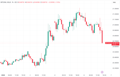 Ціна BTC падає нижче $20.70, що відображає ослаблення динаміки у порівнянні з золотом. Джерело: TradingView.