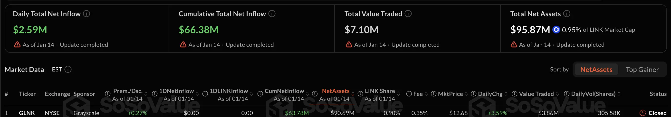 So với đó, dòng tiền ban đầu của Bitwise có vẻ khiêm tốn hơn. Tuy nhiên, sự ra mắt của ETF đã đẩy tổng tài sản ròng của ETF LINK lên 95,87 triệu đô la, gần hơn với mốc $100 triệu đô la.