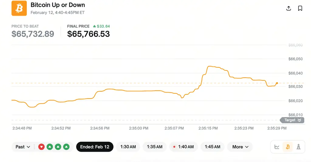 当比特币价格在 $66,286.7 附近反复磨底,日波动率收窄至 -1.27% 的窄幅区间时,链上预测市场 Polymarket 却推出了一项将“时间颗粒度”压缩至极限的新功能——五分钟比特币价格预测市场 。